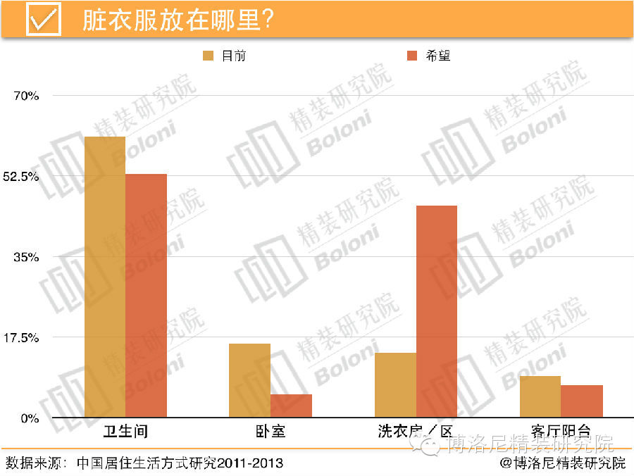 千户调查的数据证明,无论现状还是理想的状态,“专用洗衣房/区”与“卫生间”这类清洁区正是家庭脏衣服收纳的首选空间。有家就有家务,一星期的家务事常是以清洗脏衣服开始的,从操作动线考虑,也需要在这两个空间为家庭提供足够合理的脏衣服空间。